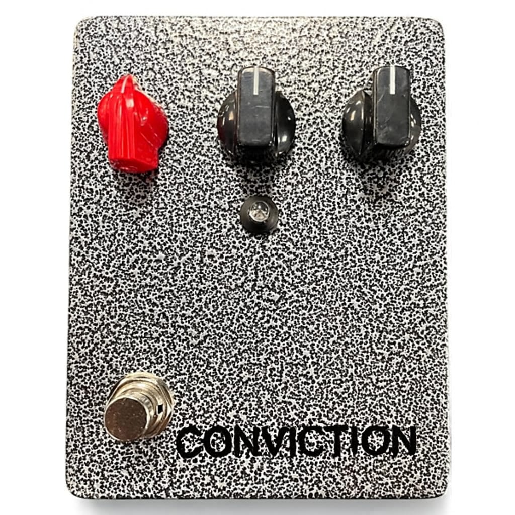 The Conviction is a hand-built overdrive designed to live in the space between classic grit and controlled chaos. At its core, Conviction delivers a responsive, touch-sensitive drive. It starts with articulate low-gain breakup. The gain evolves into aggressive, textured saturation as it is pushed.